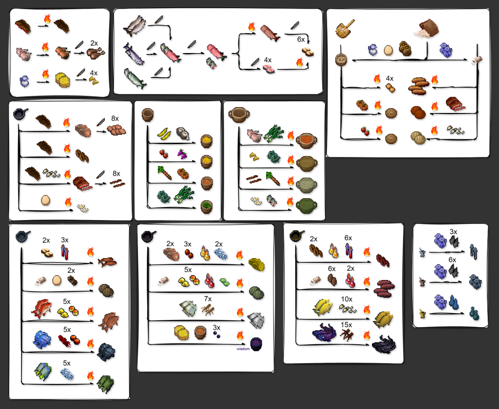 Poznámka šéfkuchaře: Při vaření je třeba mít všechny suroviny u sebe. Pak už jen stačí dvojklik na pánev/hmoždíř. Pokud se po použití nádobí nezobrazí nabídka k vaření, buď chybí některá ze surovin, nebo postava nemá dostatečnou hodnotu skillu.
